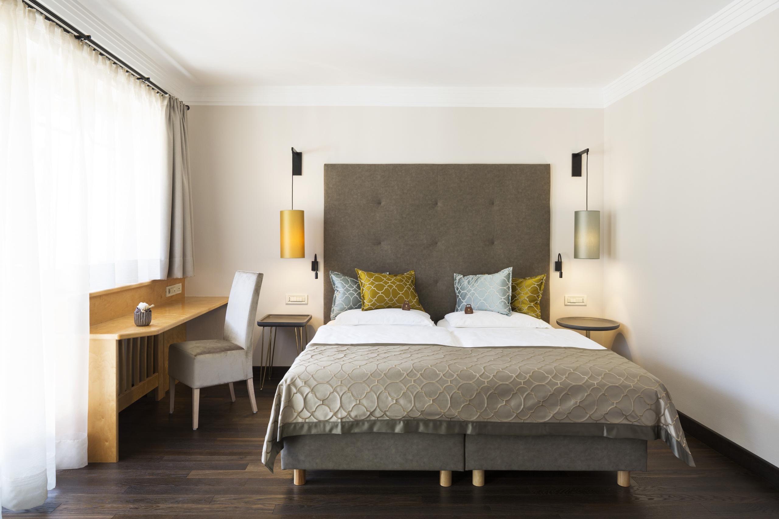 The spacious Erzherzog Johann Deluxe Suite features dark wooden floors and modern, elegant interiors. This studio-style suite accommodates 2–3 guests and offers a balcony with views of the apple orchards and terrace. The marble bathroom includes double sinks, a bathtub, separate shower, WC, bidet, and hairdryer. Telephone, radio, SAT-TV, safe, minibar, and complimentary Wi-Fi complete the stylish comfort.