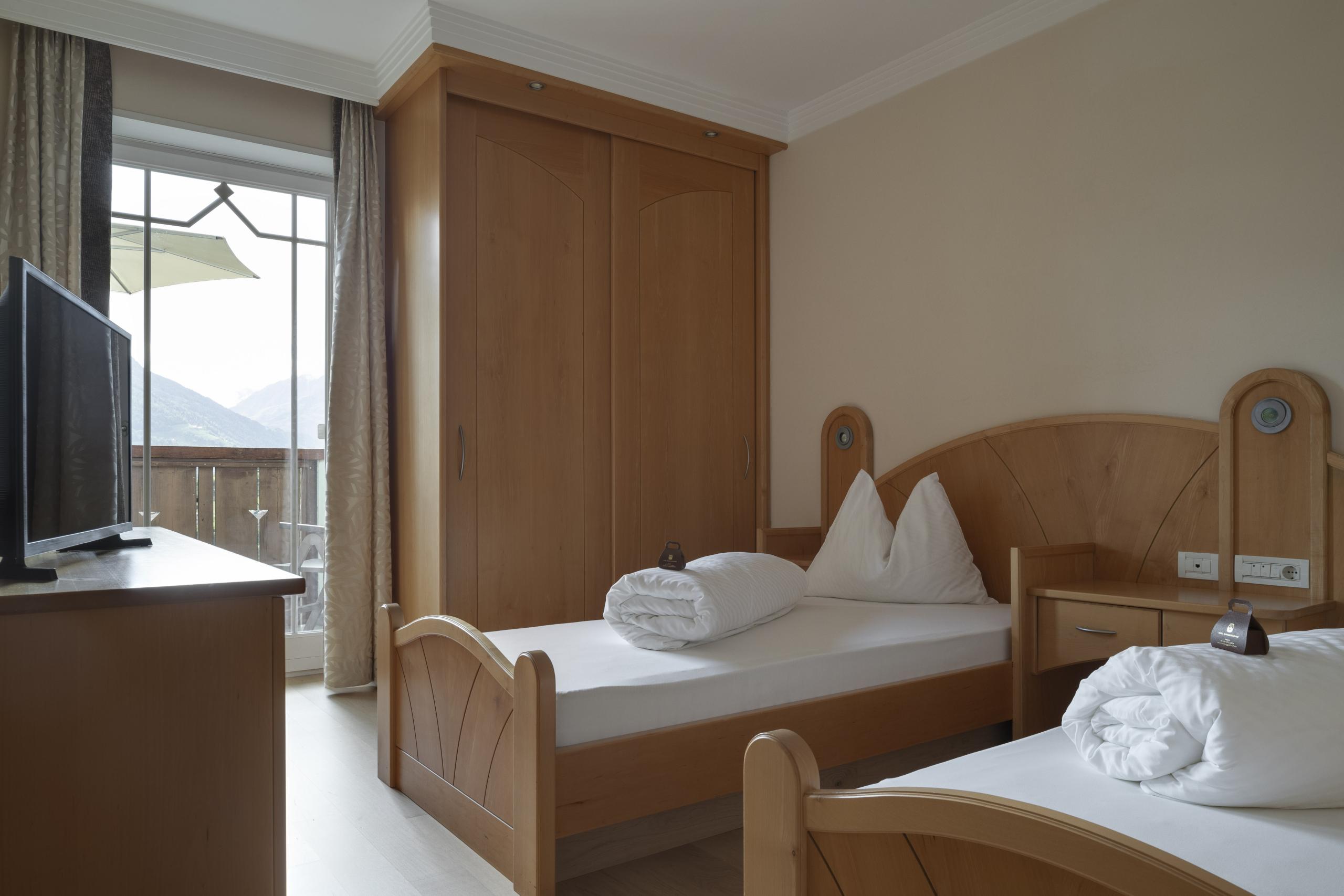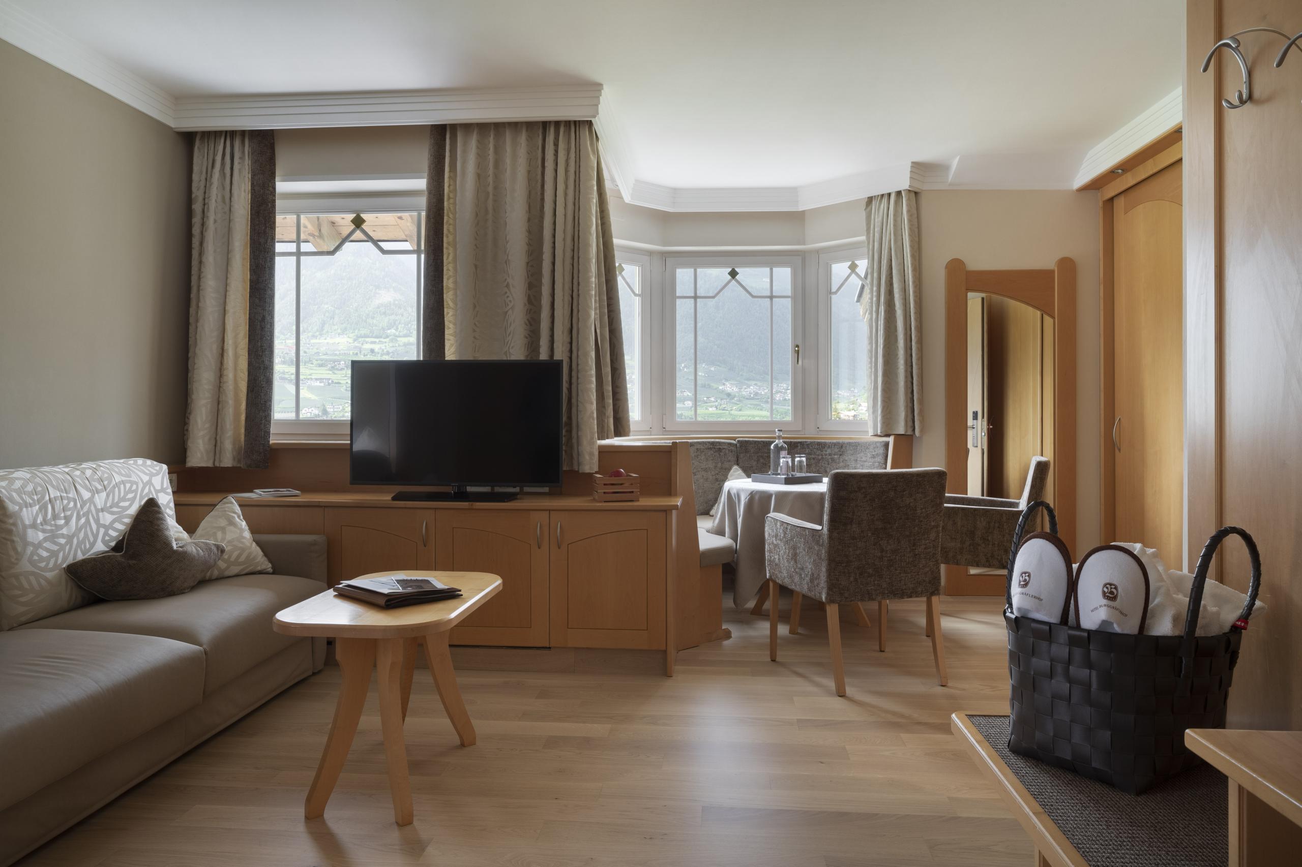 Zwei separate Schlafzimmer und ein Wohnbereich mit ausziehbarer Doppelbett-Couch auf hellem Holzboden im alpinen Stil bieten viel Platz für alle Gäste. Auf dem Balkon mit Blick auf Meran genießen Sie die Nachmittagssonne. Das elegante Marmorbadezimmer mit Doppelwaschbecken, Badewanne, Dusche, Bidet und Haartrockner, das separate WC sowie Telefon, Flatscreen-SAT-TV, Safe, Minibar, Klimaanlage und WLAN sorgen für höchsten Komfort.
