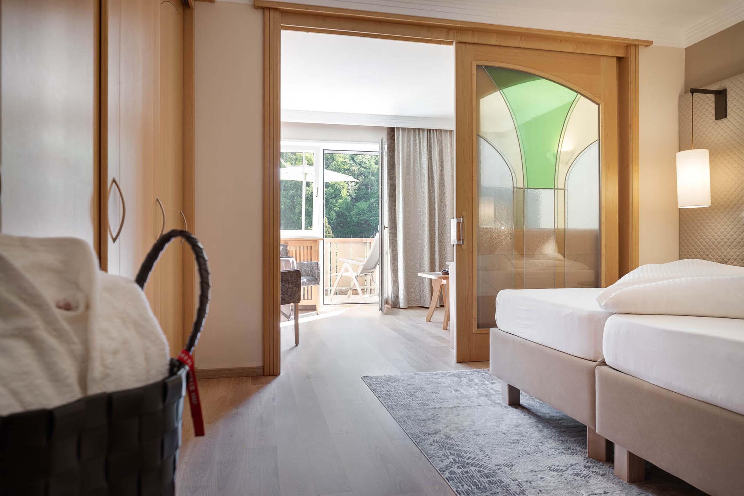 Die Suite Erzherzog Johann im alpinen Stil bietet Platz für 2–4 Personen. Wohn- und Schlafbereich sind durch eine Schiebetür getrennt und mit hellen Holzböden ausgestattet. Eine ausziehbare Doppelbett-Couch ergänzt den Schlafbereich. Vom Balkon genießen Sie die Nachmittagssonne und den Blick auf den Pool. Das elegante Marmorbadezimmer verfügt über Doppelwaschbecken, Dusche, WC, Bidet und Haartrockner. Telefon, Radio, SAT-TV, Safe, Kühlschrank und kostenloses WLAN sorgen für höchsten Komfort.