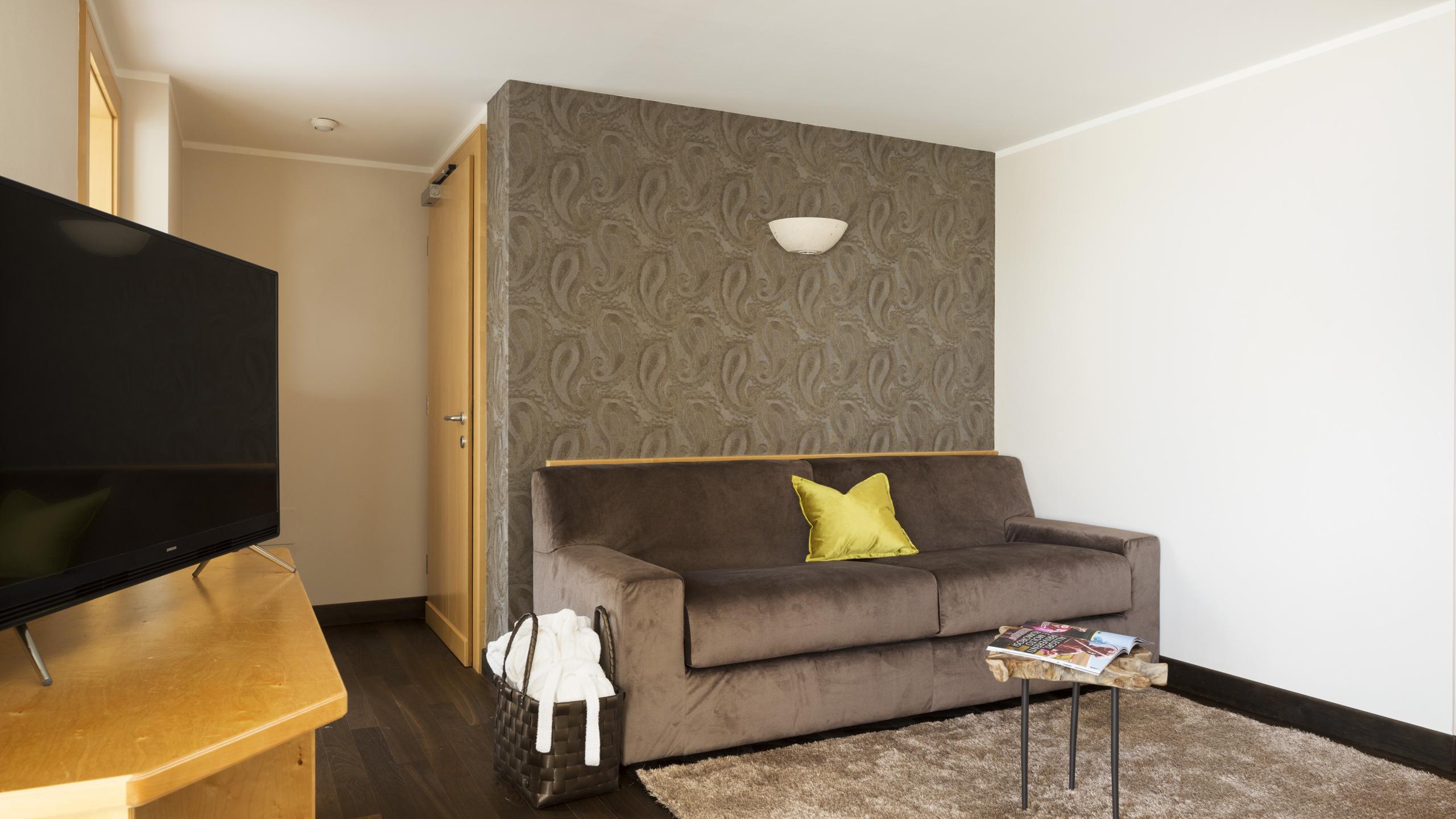 La spaziosa suite Burggräflerhof Deluxe si distingue per gli arredi moderni ed eleganti e per la grande luminosità grazie alle ampie vetrate con vista sui meleti e su Schenna. La suite monolocale può ospitare 2–4 persone e dispone di un soggiorno con divano letto matrimoniale estraibile e di un ampio balcone a L. Il bagno in marmo elegante con finestra sul tetto è dotato di doppi lavandini, vasca, doccia separata, WC, bidet e asciugacapelli. Telefono, radio, TV a schermo piatto con SAT, cassaforte, frigorifero e Wi-Fi gratuito completano il comfort raffinato.