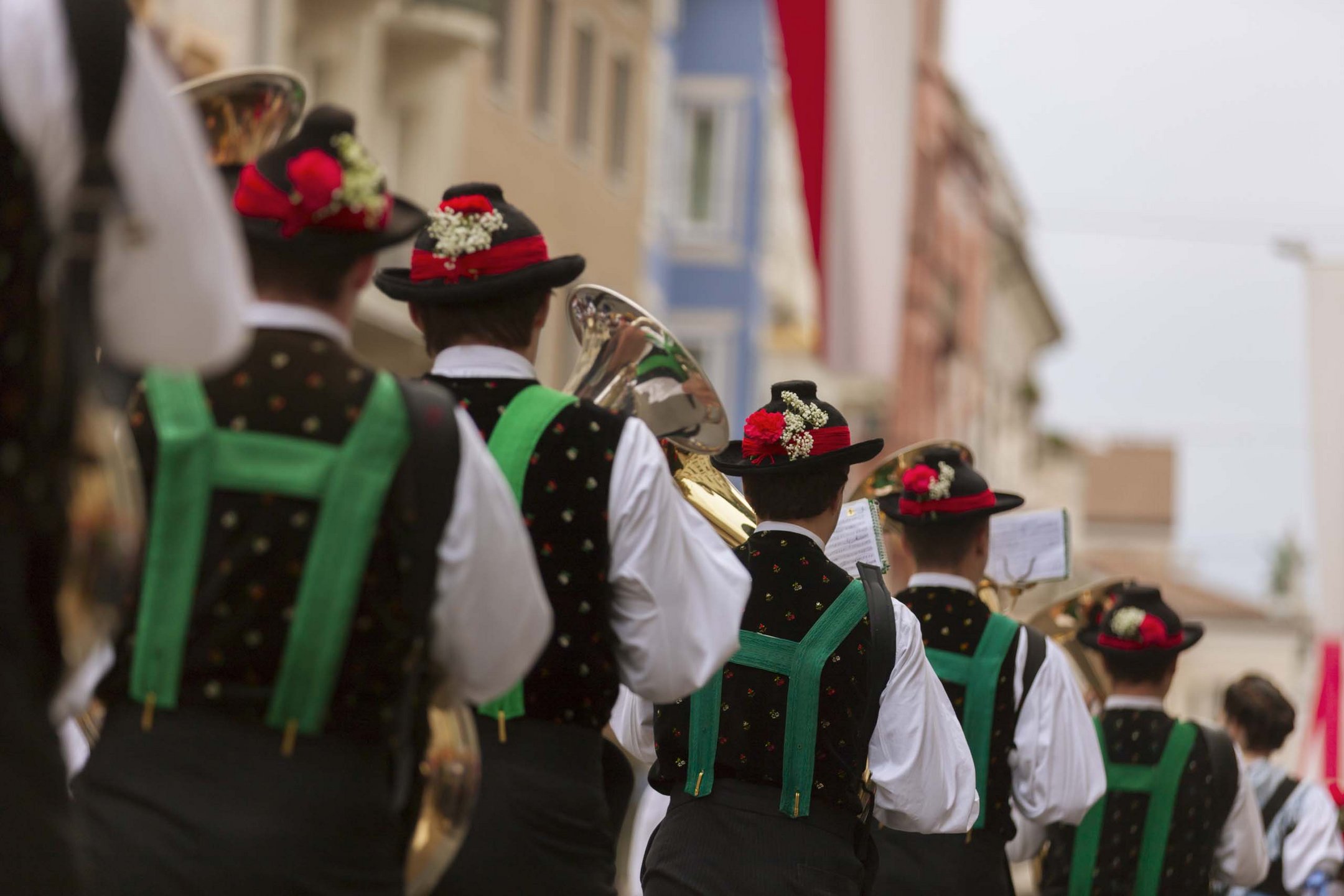 Durante l’evento, più di 60 bande musicali, associazioni di Schützen e Trachten sfilano attraverso il centro storico di Merano. I carri decorati, specialmente quelli con la corona di mele, hanno una tradizione lunga quasi quanto la Festa dell’Uva stessa, che si è tenuta per la prima volta nel lontano 1886.